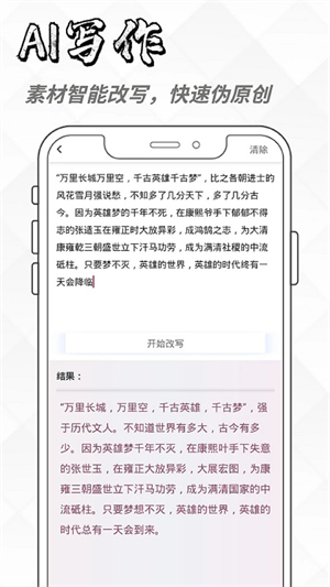 1、可以帮你智能改写文章、文案等一些文字素材,为你制作伪原创素材。