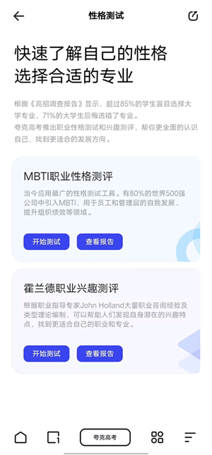 借助MBTI职业人格测验与荷兰职业兴趣测验,考生能够探究自身的兴趣、性格以及能力特点,明晰自己的职业趋向。此次考试设有20个专业以供考生匹配,并提供了各专业详尽的介绍以及开设这些专业的院校信息。