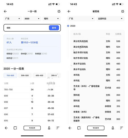 3、【查大学】、【查专业】、【一分一段】及【省控线】,对于我们选择学校,选择专业,填报志愿录取概率等,都有不错的帮助;