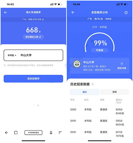 5、还可通过选择文理科,以及输入你的分数及排位等,便可以进行大学录取概率预测;