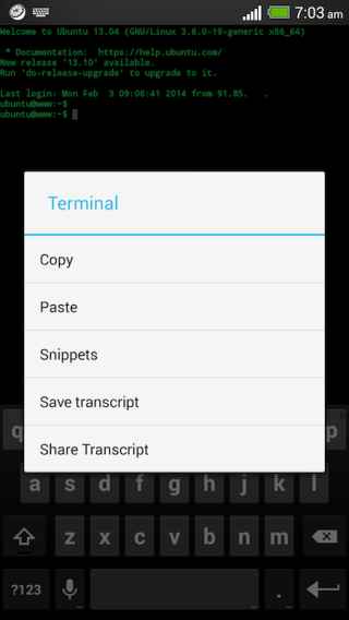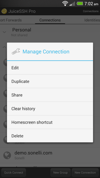 JuiceSSH 使用长按项目的标准 Android 模式来执行上下文操作。