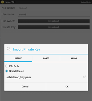 在本例中,我们假设您的服务器地址是 myserver.example.com, SSH 服务在端口 22 上运行,您的用户名是 ec2-user 并且您的私钥文件已复制到您的 Android 设备的 SD 卡.