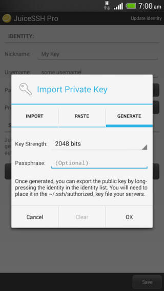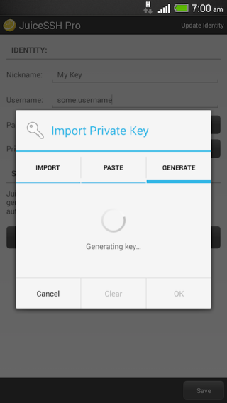 5.单击“确定”按钮生成您的密钥。JuiceSSH 使用 SecureRandom (应用了 Google 的 安全补丁 )为密钥生成提供熵。