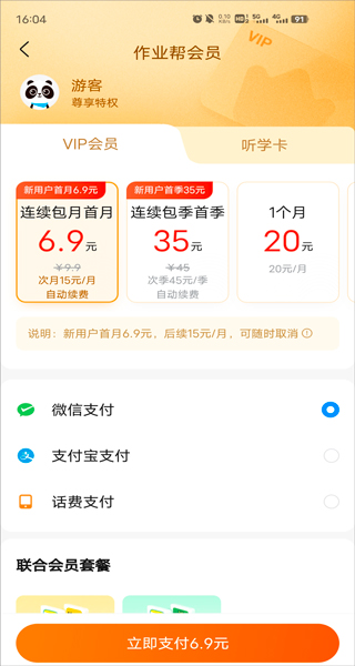 作业帮会员价格以 iAP 申请信息为准,其中连续包月 VIP 首月优惠 8 元,之后每月 19 元;包季 VIP 每季度 53 元;连续包年 VIP 每年 208 元。
