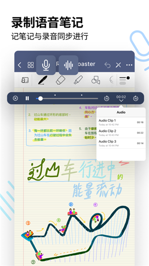 1、手写笔记功能:这款软件支持使用Apple Pencil或其他笔式输入设备进行手写笔记,并且支持多种不同的笔迹和颜色。