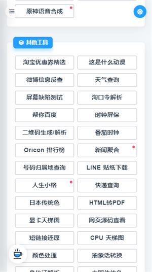 其他实用工具:淘宝优惠券精选、动漫名称查询、微博信息反查、天气状况查询、屏幕缺陷检测、帮您百度搜索、电脑录屏助手、时钟屏保设置、二维码生成与解析、新闻内容聚合、日本传统色彩展示、快递物流查询、网页源码查看、短链接还原、抽象话转换工具、新番播出时间表……