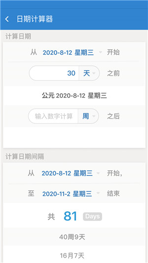 2、点击进入计算器,能看到四种算法,自上而下依次是:从某日开始过了几天、多少天之前是几号、多少天之后是几号、距离某日还有几天。