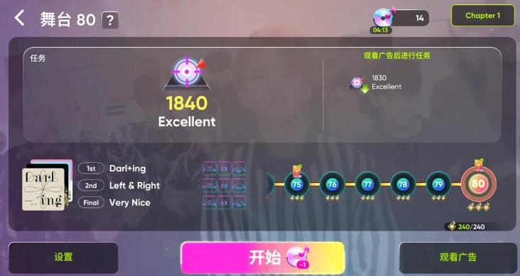如果分数没达标,除了升卡这个方法外,还可以尝试点击P1左下角进行设置,把模式调成困难、5倍速、打开镜像、打开渐隐。设置得越难,分数越高。