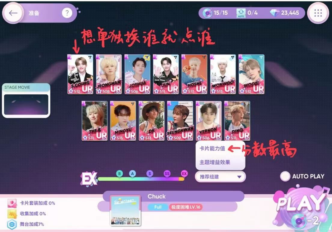 1.在打歌界面选择按照卡片能力值配置,就是每个人分数最高的卡片。想单独更换谁就点谁。