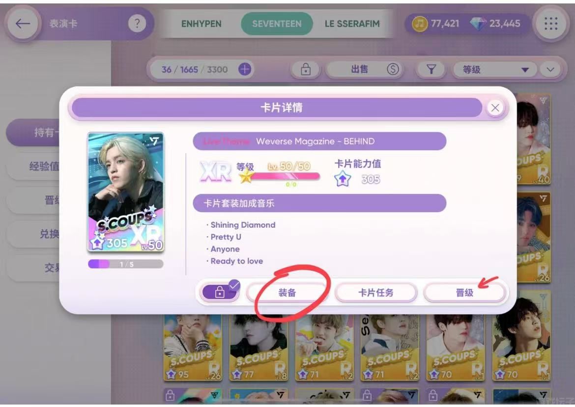 2. 点击进入后,想要配置哪张卡片,就点击对应的卡片。在弹出的界面中,点击“装备”,即配置成功。即便卡片已达满级,在此处也能直接进行晋级操作。
