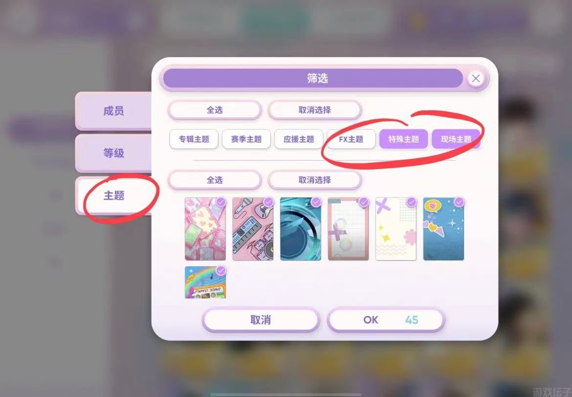 3. 若要同时配置多个成员,点击筛选按钮,挑选想要配置的成员,再选择目标卡片的主题或等级。