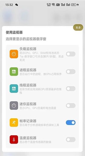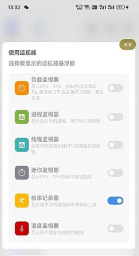 4、在监视器界面选择“帧率记录器”,屏幕上将出现帧数显示的悬浮按钮。