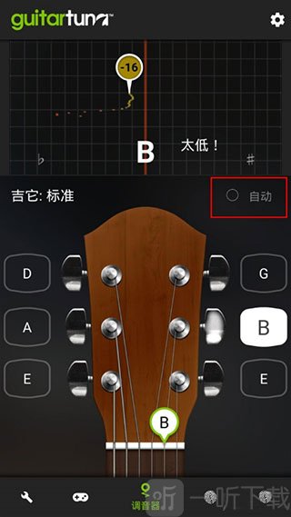 1. 开启软件,其默认模式为自动吉他调音。当拨动琴弦时,软件会展示对应的琴弦以及音准状况。持续进行调整,直至标尺处于中间位置且全部变为绿色,此时即表明调音完成。