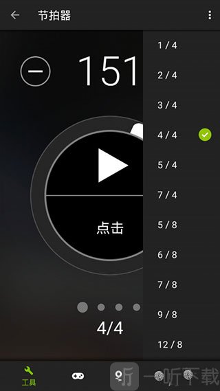 7、选择节拍器进入节拍器界面,这里可以选择节拍器速度、拍数,点击播放节拍器开始工作