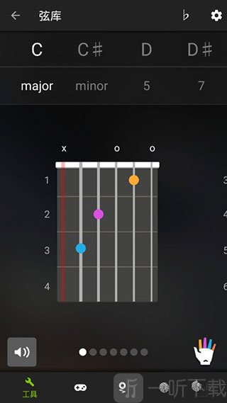 8、点击弦库进入吉他和弦库,这里列出和弦在吉他把位上的所有指型,可以点击喇叭按钮播放试听