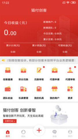 猫付创客是一个专为代理商服务的平台,软件界面极为简约清晰,它把所有收入明细清晰地呈现到用户眼前,使用户能通过查看随时了解每个数据的相关变化。与此同时,用户还能通过一键点击的方式,邀请更多人加入该平台,让众人关注自己,进而拓展自身人脉。
