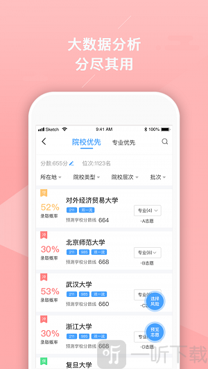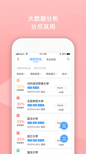 按照录取概率由低到高对院校进行排序。与此同时,他们能够查看并预测相关学院专业的录取分数与录取概率。不仅如此,他们还能够挑选候选人乐意填报的专业,并生成志愿表格。该志愿表格可在我的页面中查看。