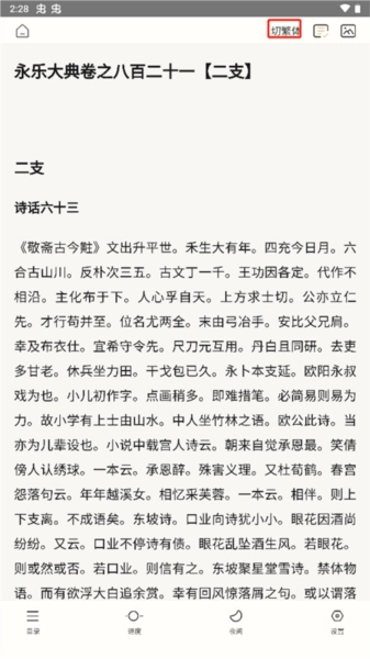 5、轻点屏幕,唤出功能栏,其中具备繁体阅读支持,点击“切换繁体”选项便可实现。