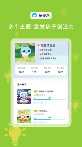 鲸美术最新版不仅是一个在线绘画学习平台,更是儿童艺术启蒙的理想伙伴。我们坚信每个孩子都蕴含着独特的艺术潜力,因此,我们倾力打造了一款集趣味性与教育性于一体的。采用AI互动教学,让孩子在游戏和动画中自然地接触和领悟艺术的魅力。同时,我们的科学分龄体系,确保每位小画家都能找到最适合自己的课程,无论他们是初次尝试还是已具绘画基础。