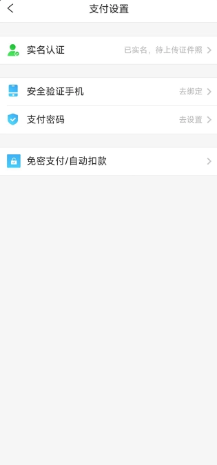 进来支付设置界面后能看里面有实名认证、安全验证手机、支付密码、免密支付/自动扣款4个功能;实名认证就是将自己的个人信息绑定在账号上;而安全验证手机则是将用户的手机号与账号进行绑定,以便账号的安全和便于让用户使用手机号进行登录;支付密码则是当用户进行消费时保障用户的财产安全;下面就是我们今天教程的核心:免密支付了,我们现在点击它。