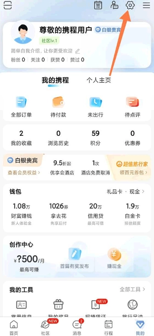 进入携程旅行后,点击底部的”我的“进入个人中心,可以看见个人中心里面有着许许多多和我们自己有关的功能,这个时候我们需要点击右上角的小齿轮图标进入设置。