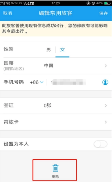 5、点击该乘车人旁边的“编辑”按钮或者“删除”按钮。