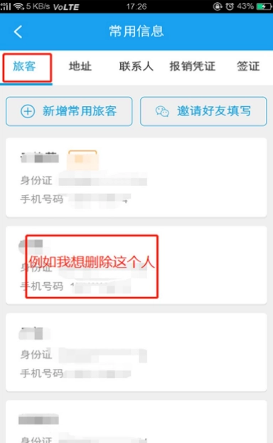 4、在常用乘坐人列表中,找到要删除的乘坐人。