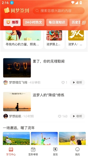 圆梦签到是一款集在线阅读健康养生资讯与早晚安海报分享功能于一体的应用程序。用户能够通过签到打卡获取用户积分,凭借这些积分解锁名片功能的使用权限,还能兑换各类奖励商品。在分享资讯、早晚安海报时,用户可通过嵌入个人二维码的形式,拓展好友人脉,从而实现用户自我阅读学习与分享增加人脉的双重目的。