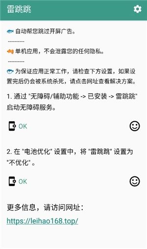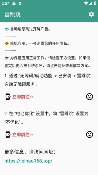 1、在本页面进行雷跳跳操作,接着打开。首次开启时,系统会要求我们允许无障碍权限并关闭电池优化。