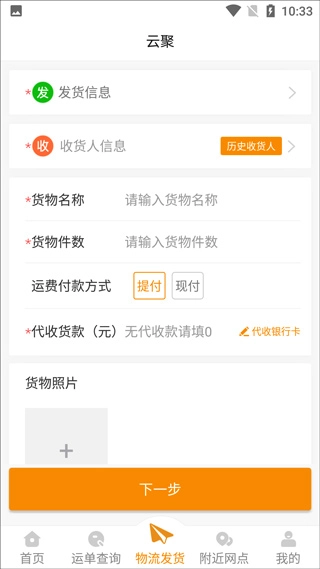 然后输入发货单详细信息,点击下一步发布订单就会有专门的货车司机接单,在我的发货查看详情。