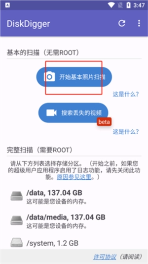 1、进入DiskDigger首页,点击开始基本照片扫描。