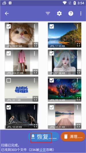 2、系统会自动扫描你手机中可恢复的图片文件,勾选你想要恢复的图片,点击恢复。