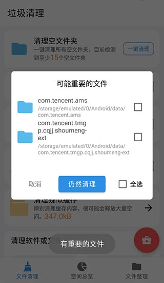 6、清理完成后,系统还会提示你有重要文件是否清理,可以点击查看,不需要清理可以“取消”。
