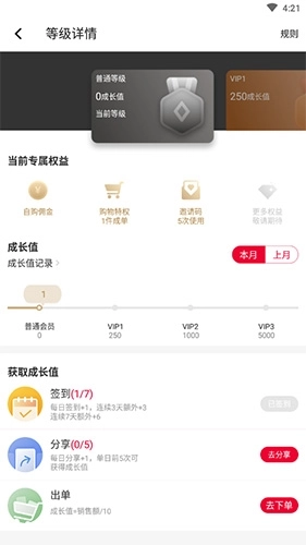 用户等级与用户成长值紧密相关,成长值越高,用户等级也就越高。获取成长值的途径主要有签到、分享和下单这三种方式。