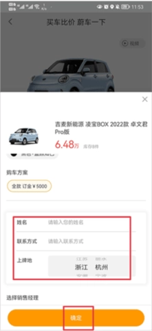 3、选择汽车颜色,并将姓名联系方式以及上排地点后,点击确定然后支付定金
