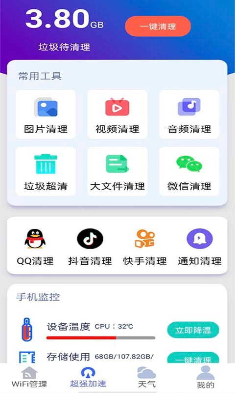 1别看它体积小巧,功能却极为强大。一键清理、一键加速等实用功能应有尽有。不仅能够加速WiFi,还能清理手机里多余的内存,删除垃圾文件,让您使用手机更加轻松,彻底告别卡顿,尽情享受如丝般顺滑的操作体验。