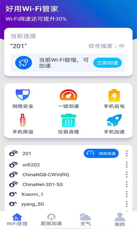 好用WiFi管家,一款超好用的WiFi连接软件。它不仅能加速与保护WiFi,还能管理手机内存,让手机使用起来更加舒心。此外,它具备加密功能,可实时监管自家WiFi,使其坚不可摧。而且,使用过程中手机电池也不会发烫,若有需求即可使用。