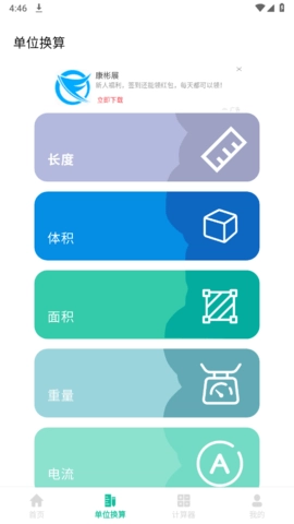 2. 在“单位换算”板块,能够针对体积、长度、面积等开展单位换算。