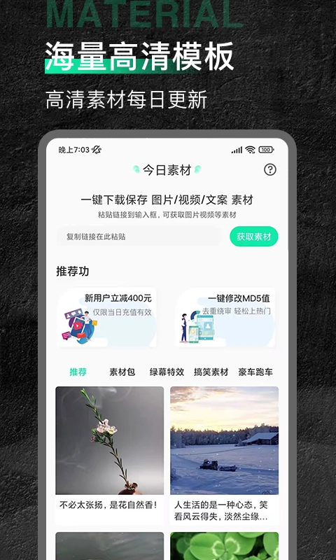 今日素材堪称一款极为专业的素材工具。在此,不仅有海量优质的素材模板,还有丰富的线上学习素材技巧,能够迅速助力你打造出高质量的短视频。别再犹豫啦,今日短视频素材正待你领取,感兴趣的朋友赶快行动起来吧!