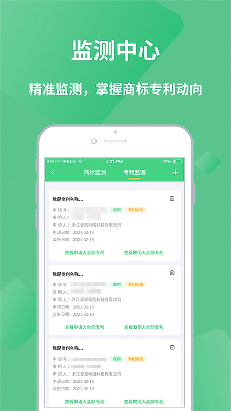 商标/专利监测:用户能够通过查看所关注的商标/专利详情,实时获取法律状态变更、异常变更等信息,及时知晓商标/专利动态。