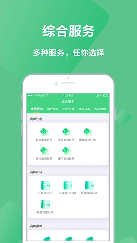 商标综合服务:提供商标注册、商标补证、商标案件、商标变更等服务,同时提供版权服务和设计服务。