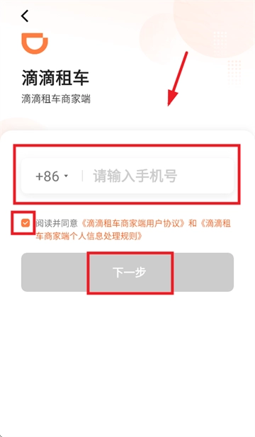 请输入手机号码,同时勾选表示阅读并同意《滴滴租车商家端用户协议》以及《滴滴租车商家端个人信息处理规则》,完成上述操作后点击“下一步”。