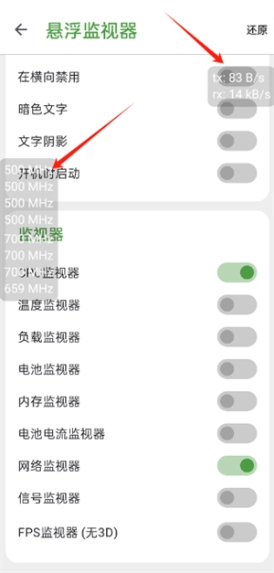 2、想要查看帧率必须授予悬浮窗权限,权限授予完毕后点击cpu监视器和网络监视器。