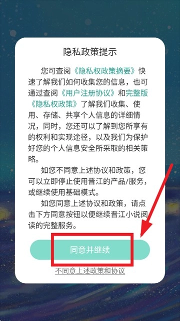 1. 首先安装小书喵悦读,安装完成后打开该应用。打开时,会出现隐私政策提示,需同意此提示后点击继续。