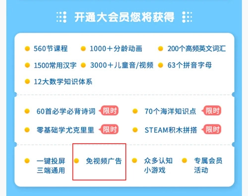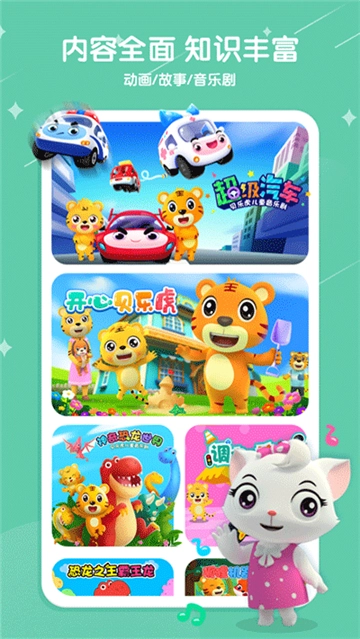 2、结合不同年龄的早教重点,量身定制了听(儿歌)看(动画)玩(兴趣)学(启蒙)四个方面的产品。