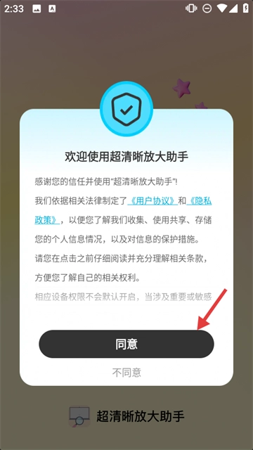 1、阅读【用户协议】和【隐私政策】,点击【同意】,开启超清晰放大助手服务。