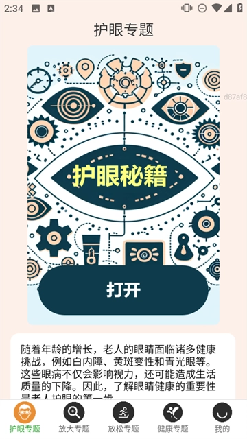 2. 前往【护眼专题】,点击【护眼秘籍 - 开启】,知悉老人眼健康面临的挑战以及防护知识。