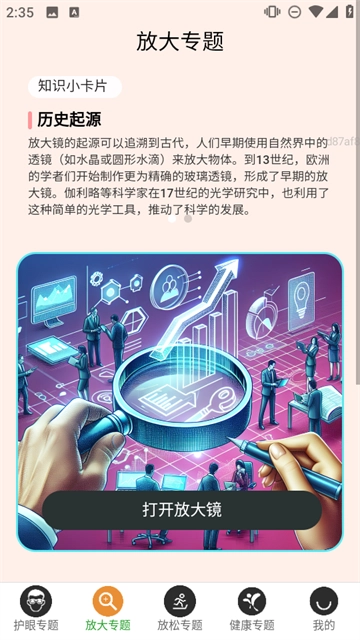 3、切换至【放大专题】,查看【历史起源】的介绍,点击【打开放大镜】来体验放大功能。