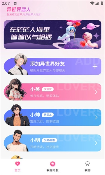 《异世界恋人》免费版是一款依托人工智能技术打造的虚拟伴侣应用软件。它为用户呈现出一个虚拟伴侣形象,在这里,您能够与之展开交流、进行互动,收获心灵的治愈。在这个虚拟世界里,您可以尽情体验与伴侣之间那种真实的情感联系以及互动关系。该软件运用了先进的现代人工智能技术,借助这项智能技术,能够轻松识别并从语言、行为、面部表情等多个维度,为每个人提供精准的情感反馈。有相关需求的用户,不妨快速尝试《异世界恋人》。