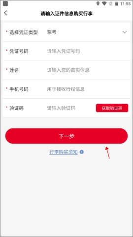 2、选择“行李”服务,轻松端口输入证件信息,体验无缝在线购票。